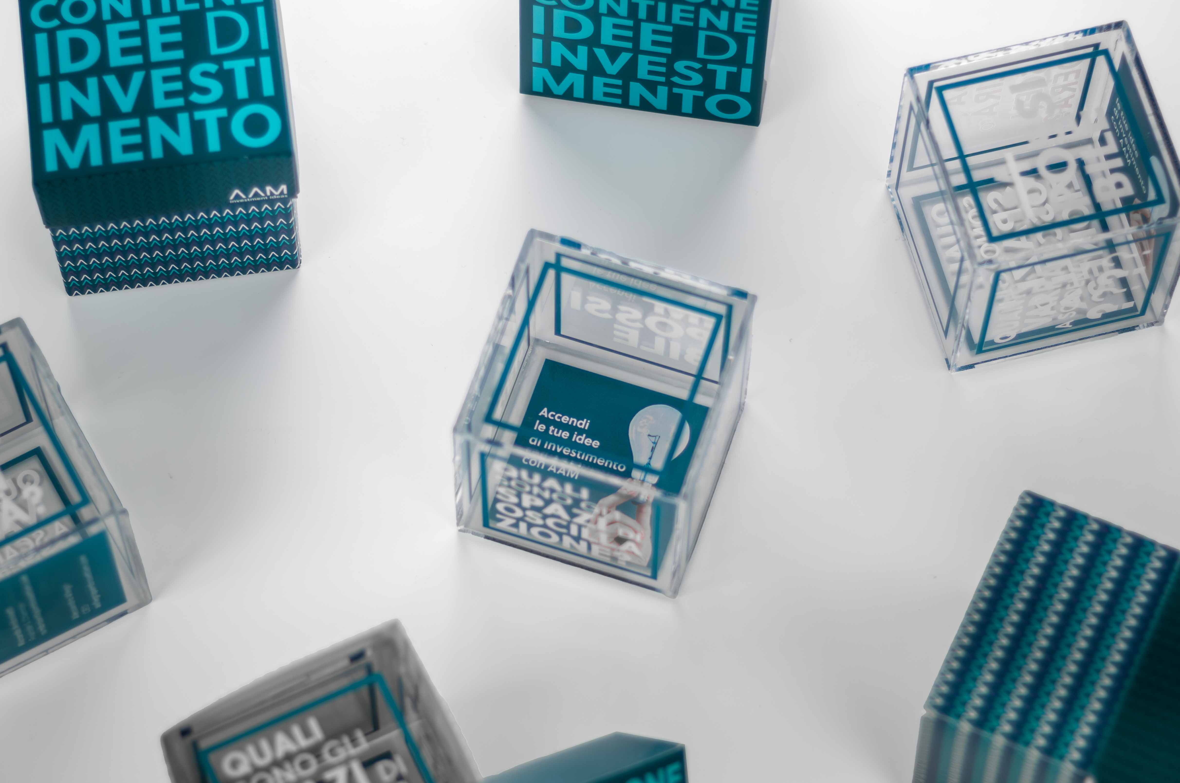 The idea was to create a simple yet visually interesting object to present AAM business in an original way. That lead to the production of transparent plexiglass cubes filled with questions, financial topics and AAM contacts that was delivered to some of the most influential figures in finance.