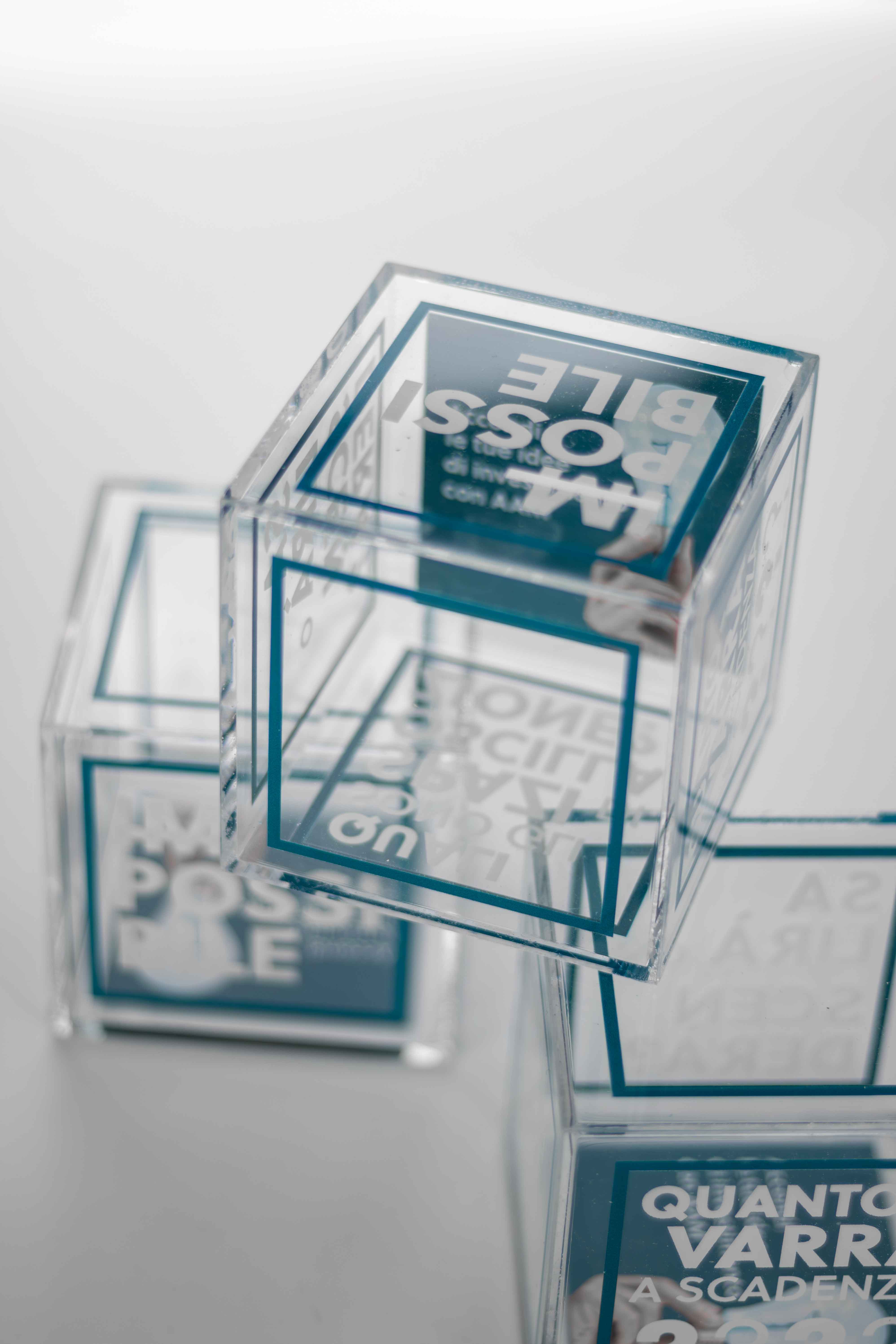 The cube perfectly represents the new AAM corporate identity and the material helps it stand out and convey the feeling of transparency of the brand.