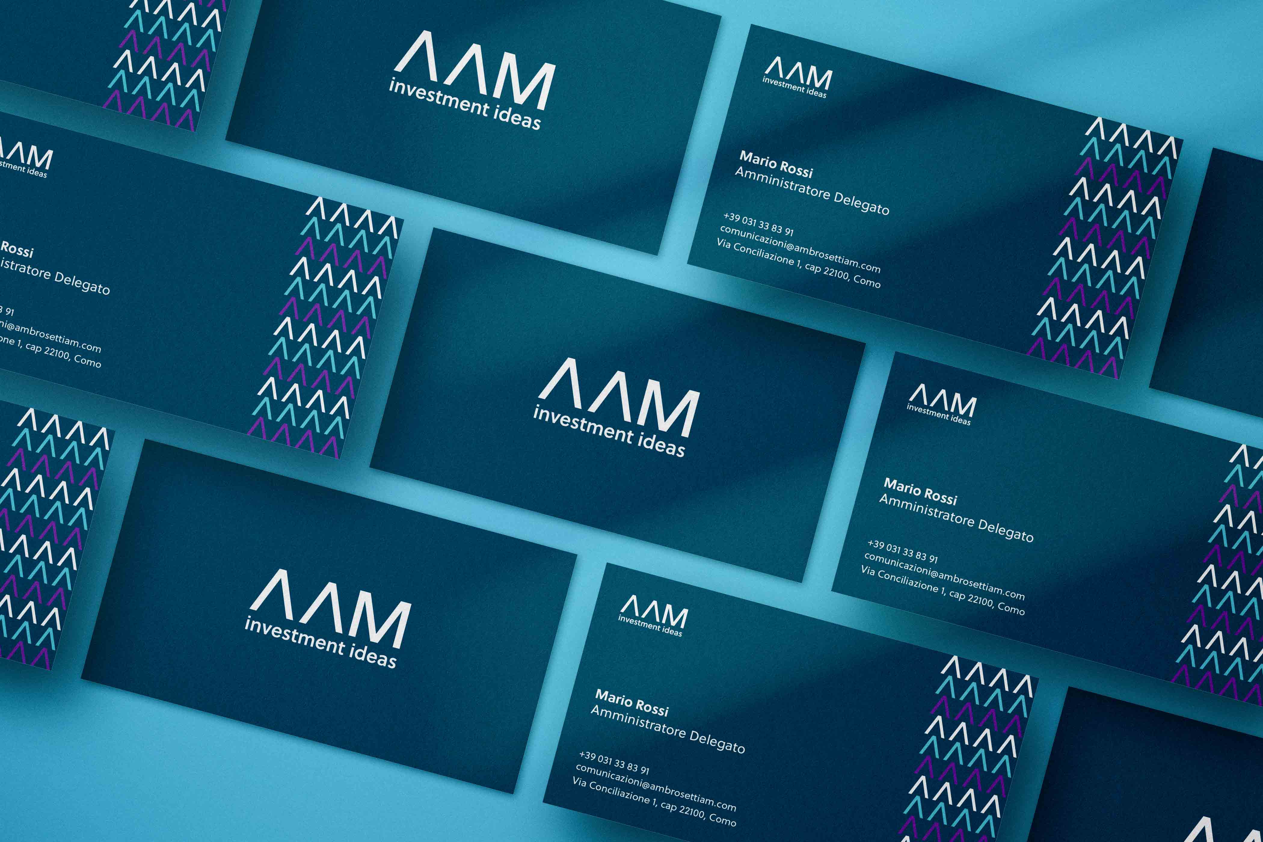 The "A" letter from the logotype stands on its own as the core graphical element that brings all the corporate identity together. This minimal upward arrow is also a growth sign that helps create pattern and movement inside the design and communicate the AAM proposal to reach new goals and objective in the financial field.